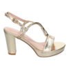 Con un cierre al tobillo asegurado por una hebilla, estas sandalias ofrecen un ajuste perfecto y comodidad para todo el día. El cruce por encima del pie añade un toque de estilo contemporáneo, mientras que la semi-plataforma proporciona estabilidad y soporte. La puntera semi-redonda y el lujoso color dorado combinan a la perfección, haciéndolas ideales para ocasiones especiales o una noche elegante. Con estas sandalias, tus pasos serán siempre con confianza y glamour.